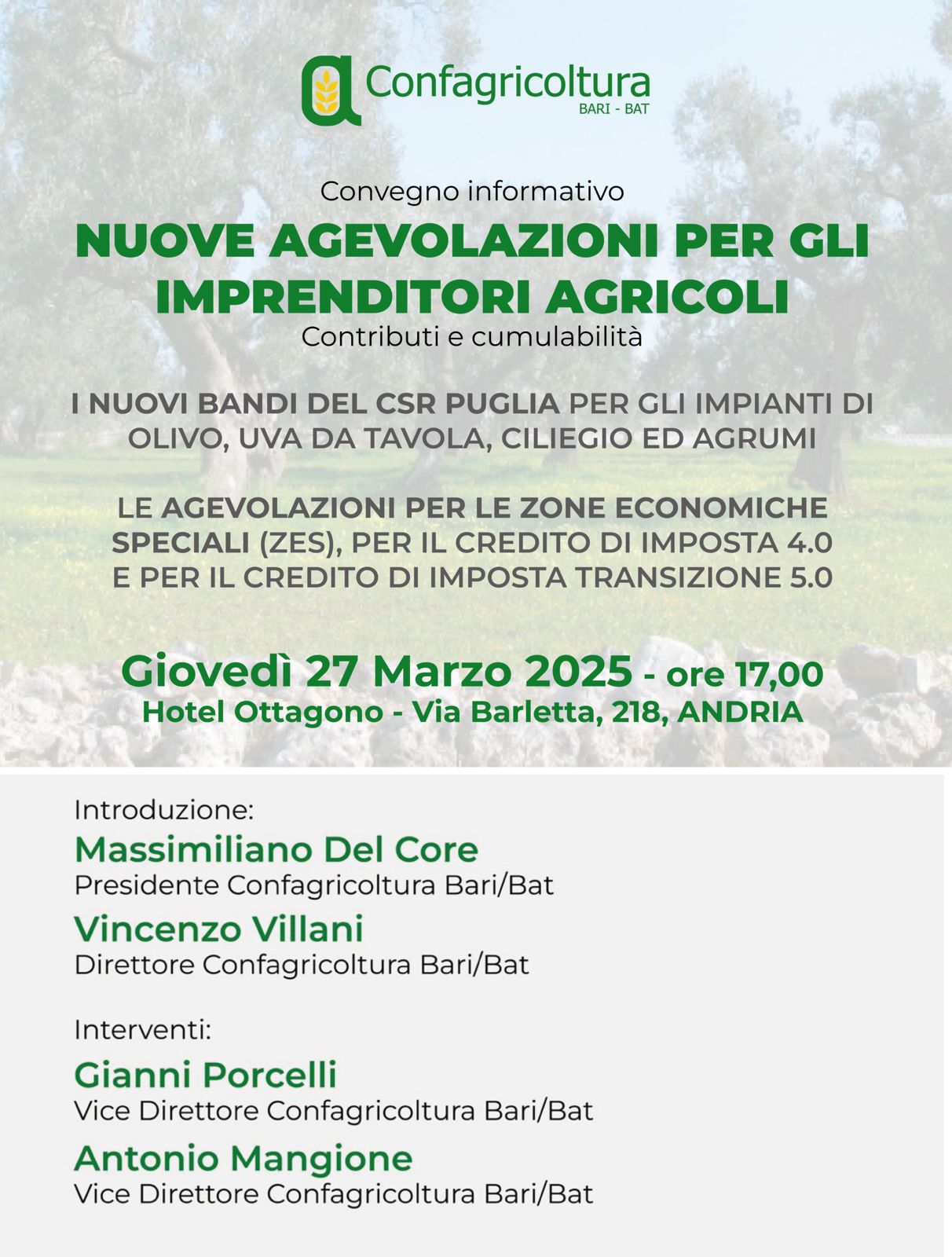 Giovedì 27 marzo alle ore 17.00, presso l’Hotel Ottagono ad Andria (Via Barletta,218), si terrà un importante convegno dedicato al bando CSR Puglia che finanzia nuovi impianti di olivo, uva da tavola, ciliegio e agrumi.