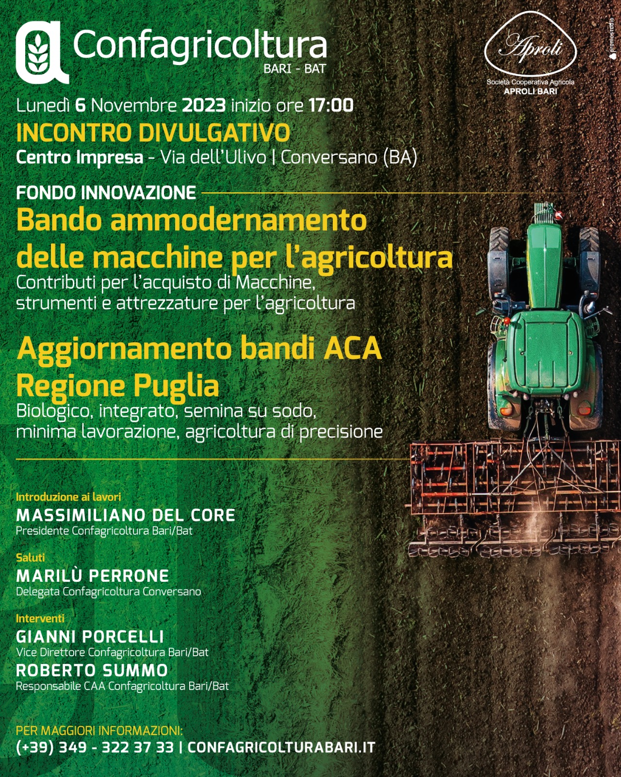 L’incontro sarà dedicato al nuovo bando per i contributi all’acquisto di macchinari ed attrezzature agricole ed un aggiornamento sui bandi per il biologico, integrato, semina su sodo , minima lavorazione in corso di strutturazione da parte della Regione Puglia.