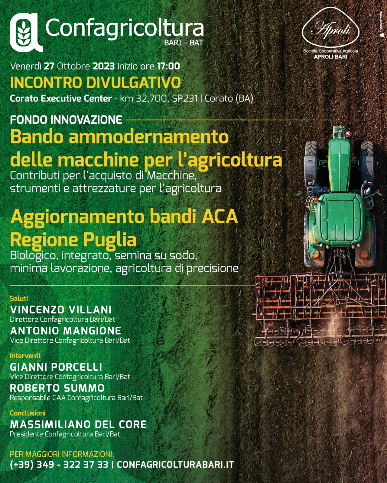 Confagricoltura Bari-Bat, in collaborazione con Aproli Bari, organizza un importante incontro divulgativo sul nuovo bando per i contributi all’acquisto di macchinari ed attrezzature agricole ed un aggiornamento sui bandi per il biologico, integrato, semina su sodo , minima lavorazione in corso di strutturazione da parte della Regione Puglia.