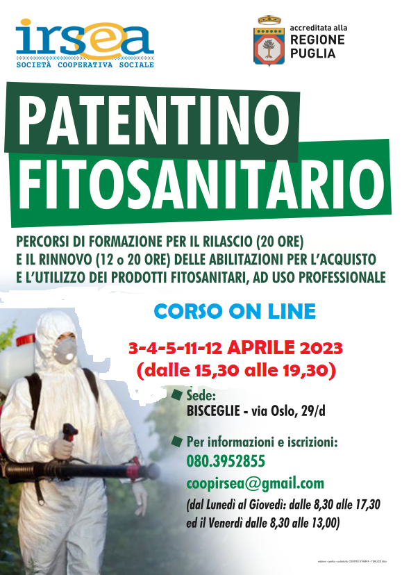 Per acquistare e impiegare prodotti fitosanitari (agrofarmaci o fitofarmaci) classificati come tossici, molto tossici e nocivi, in attuazione del D.M 22/01/2014 e DGR della Regione Puglia n.627/anno 2015, dal 26 novembre 2015 è necessaria un’apposita autorizzazione comunemente nota come “Patentino Fitosanitario” (D.P.R. 290/01) che si ottiene frequentando un corso di formazione specifico della durata di 20 ore (con frequenza obbligatoria minima del 75%) e superando l’esame finale previsto.