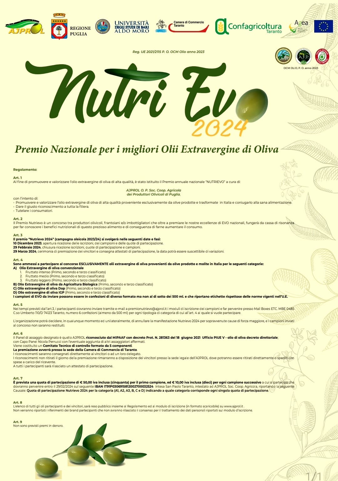 E’ fissata al 29 febbraio 2024 la scadenza per iscriversi al Premio Nazionale “NUTRIEVO”, ideato e promosso da Ajprol, la società cooperativa di produttori olivicoli pugliesi.