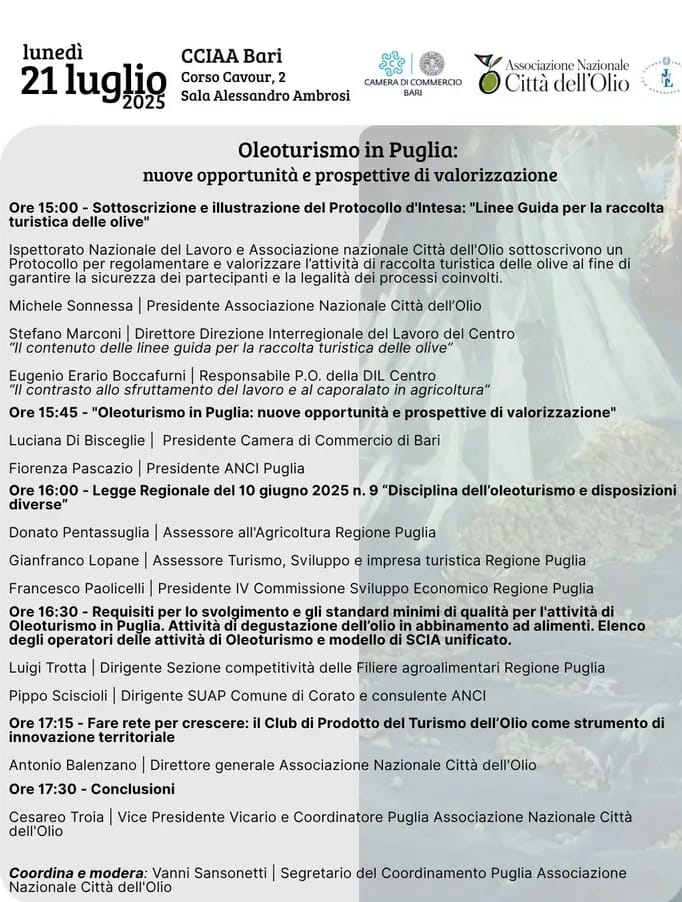 Segnaliamo convegno dal titolo “Oleoturismo in Puglia: nuove opportunità e prospettive di valorizzazione” organizzato dal Coordinamento regionale delle Città dell’Olio della Puglia che si terrà lunedì 21 luglio alle ore 15:00 presso la Sala Alessandro Ambrosi della Camera di Commercio di Bari (Corso Cavour, 2).