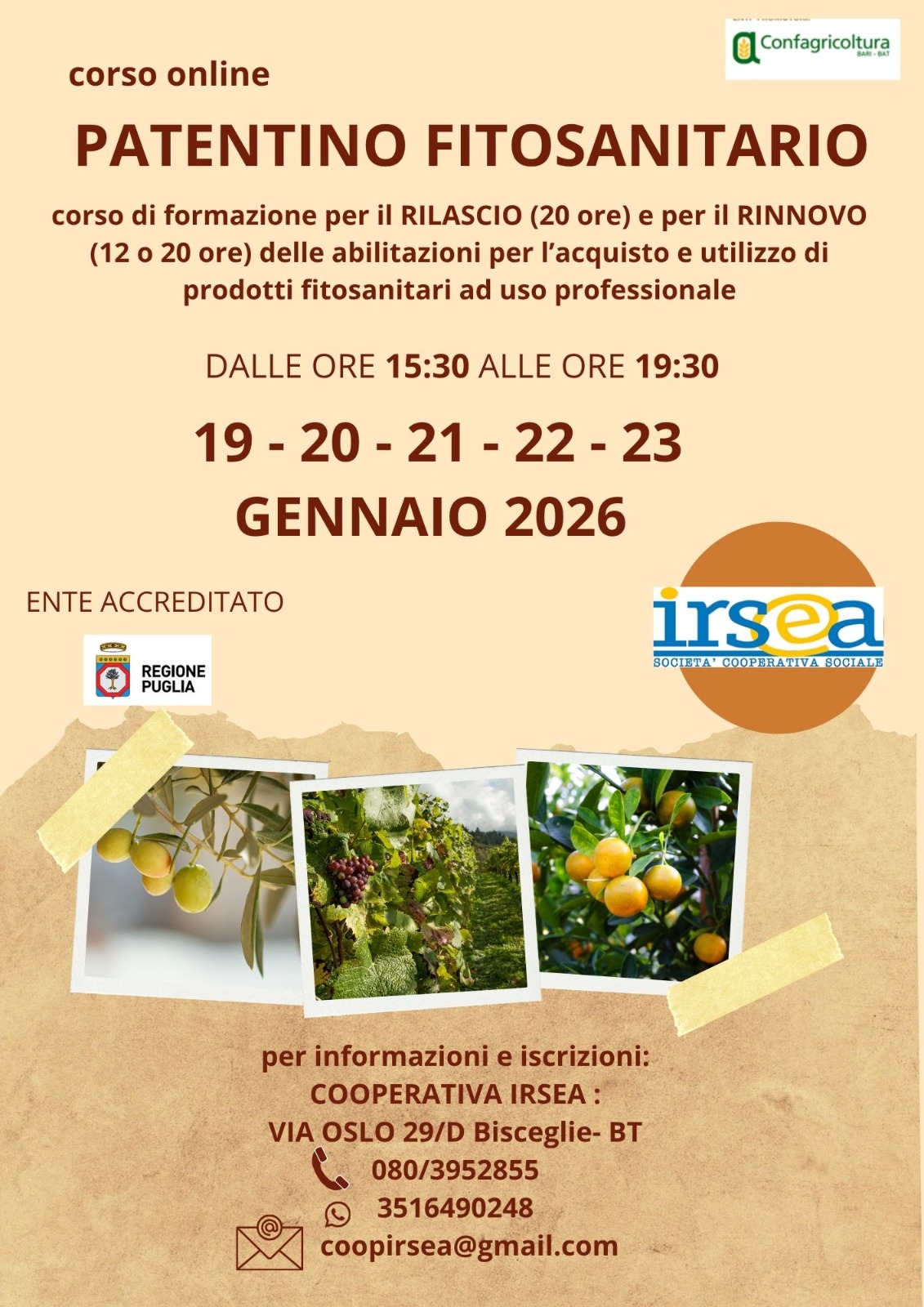 Sono ufficialmente aperte le iscrizioni al corso di formazione online previsto per gennaio, finalizzato al rilascio o al rinnovo del “Patentino Fitosanitario”, necessario per acquistare e impiegare prodotti fitosanitari classificati come tossici, molto tossici e nocivi, in attuazione del D.M 22/01/2014 e DGR della Regione Puglia n.627/anno 2015.