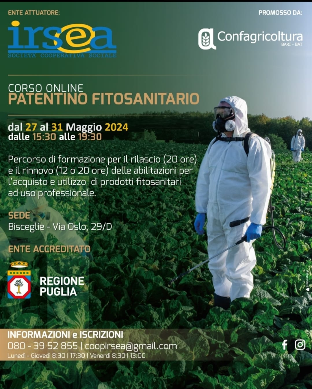Partirà a maggio un corso di formazione online per il rilascio o il rinnovo del “Patentino Fitosanitario” (D.P.R. 290/01) necessario per acquistare e impiegare prodotti fitosanitari (agrofarmaci o fitofarmaci) classificati come tossici, molto tossici e nocivi, in attuazione del D.M 22/01/2014 e DGR della Regione Puglia n.627/anno 2015.