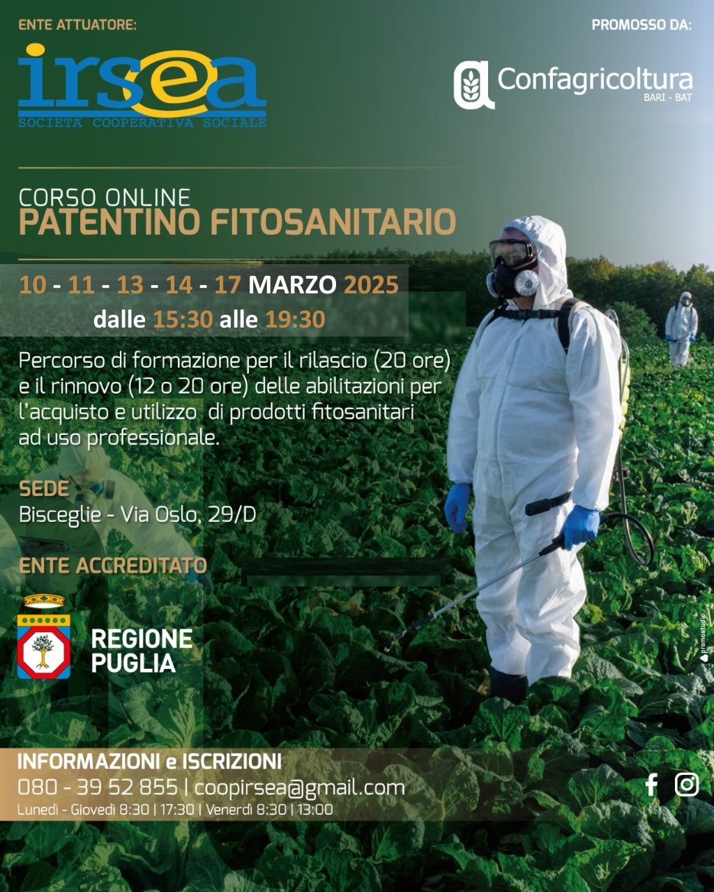 Partirà a marzo un corso di formazione online per il rilascio o il rinnovo del “Patentino Fitosanitario” necessario per acquistare e impiegare prodotti fitosanitari (agrofarmaci o fitofarmaci) classificati come tossici, molto tossici e nocivi, in attuazione del D.M 22/01/2014 e DGR della Regione Puglia n.627/anno 2015.