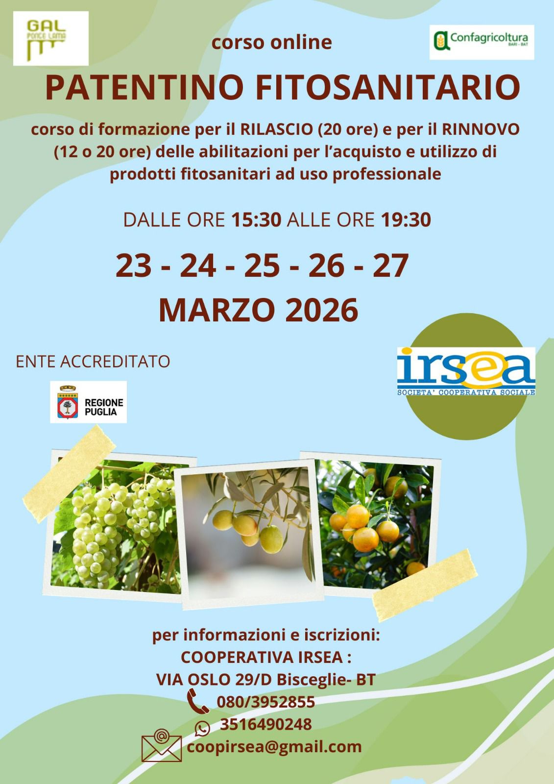 Sono ufficialmente aperte le iscrizioni al corso di formazione online previsto per marzo, finalizzato al rilascio o al rinnovo del “Patentino Fitosanitario”, necessario per acquistare e impiegare prodotti fitosanitari classificati come tossici, molto tossici e nocivi, in attuazione del D.M 22/01/2014 e DGR della Regione Puglia n.627/anno 2015.