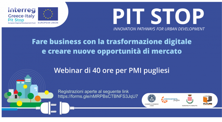 Lo organizza la Camera di Commercio di Bari, in collaborazione con Unioncamere Puglia e il Politecnico di Bari, nell’ambito del progetto “PIT STOP – INNOVATION PATHWAYS FOR URBAN DEVELOPMENT”, finanziato a valere sul Programma INTERREG V-A Greece-Italy 2014-2020.