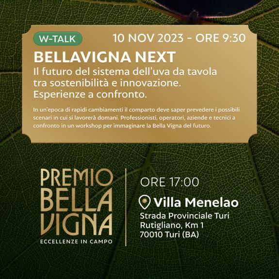 Il 10 novembre 2023 alle ore 09:30 presso Villa Menelao si terrà W-TALK Premio Bella Vigna 2023, di cui Confagricoltura Bari-Bat è sponsor contributor.