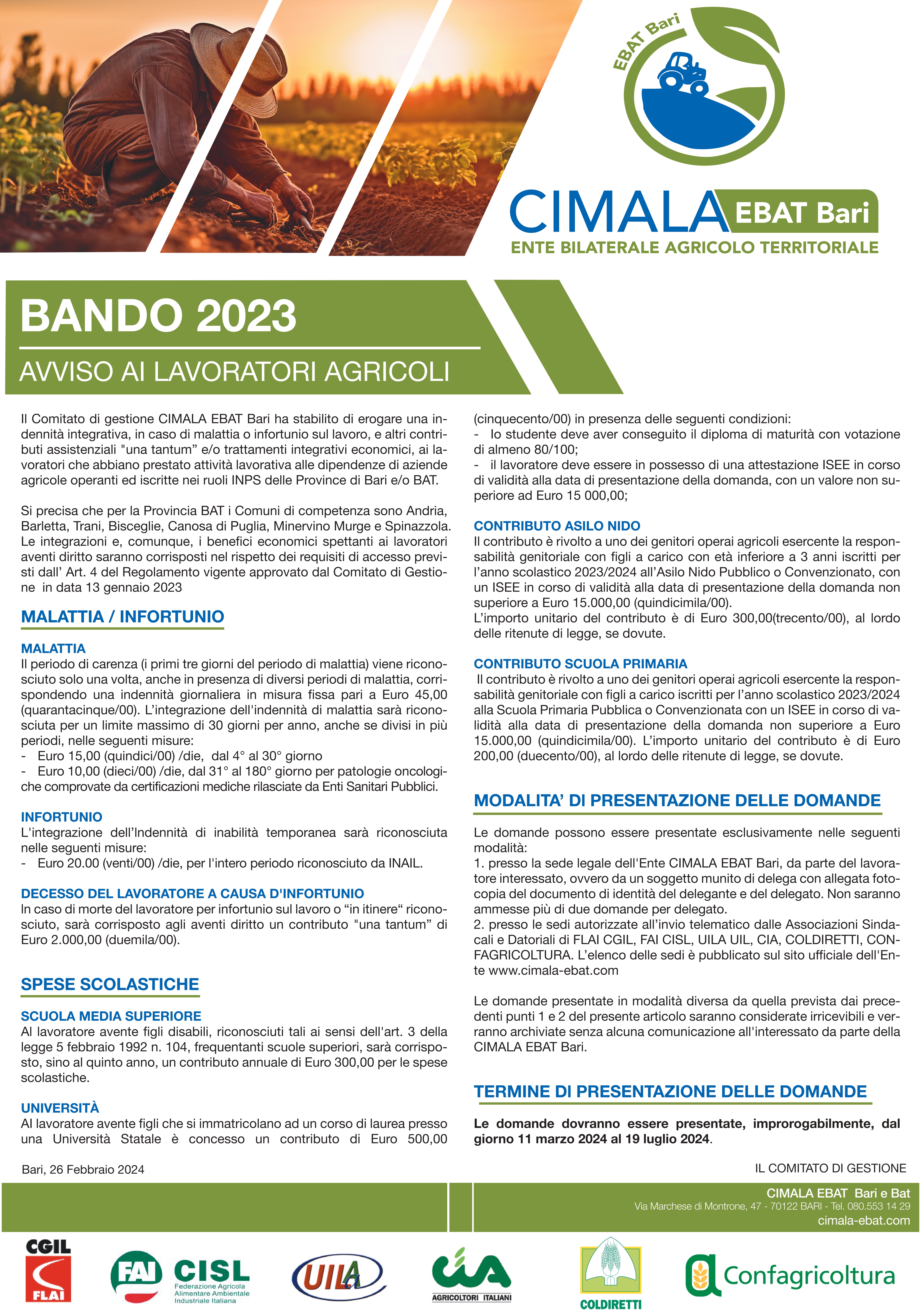 Si ricorda inoltre che, a partire da quest’anno, il Comitato di gestione ha deciso di affidare agli operatori l’incarico di estrapolare e consegnare le C.U. 2024, relative alle prestazioni erogate nell’anno 2023, agli operai agricoli.