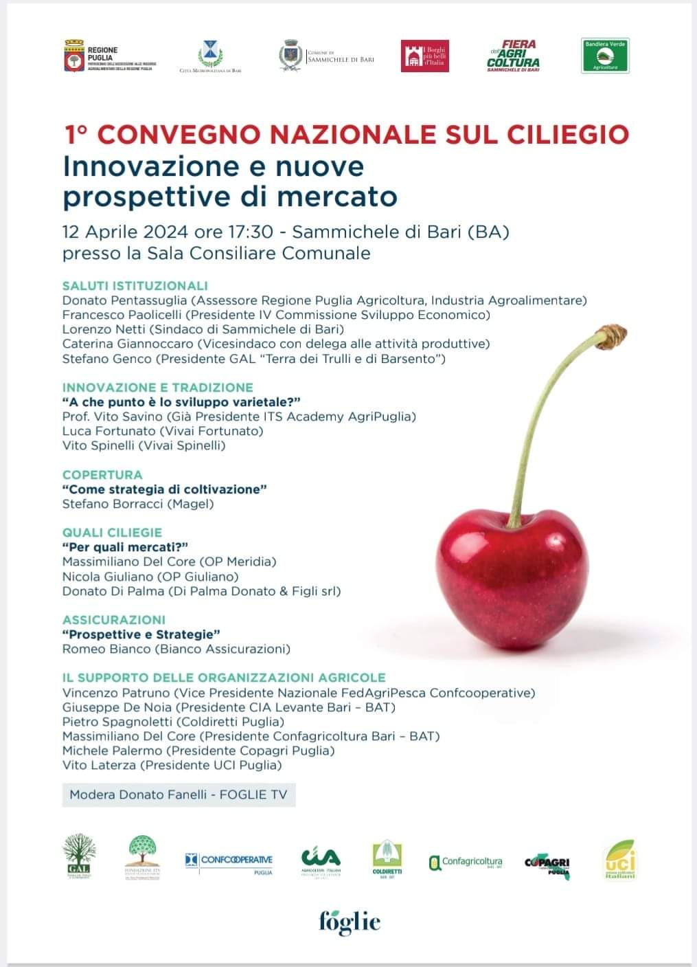 L’Amministrazione Comunale di Sammichele di Bari, in collaborazione con l’Assessorato all’Agricoltura della Regione Puglia, la Città Metropolitana di Bari, il GAL “Terra dei Trulli e di Barsento”, le Organizzazioni Agricole e la rivista Foglie, ha il piacere di annunciare l’organizzazione del 1° Convegno Nazionale sul Ciliegio di Sammichele di Bari.