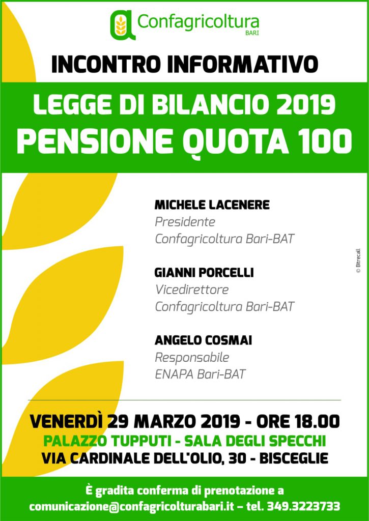 Cosa cambia per le aziende agricole e per tutti i cittadini con le novità inserite nella legge di Bilancio 2019 e l’introduzione del provvedimento “Quota 100”? Per rispondere alla domanda e chiarire ogni aspetto normativo, Confagricoltura Bari-Bat ha organizzato un incontro formativo: l’appuntamento è venerdì 29 marzo, alle ore 18, nella sala degli Specchi di Palazzo Tupputi, in via Cardinale dell’Olio, 30, a Bisceglie.