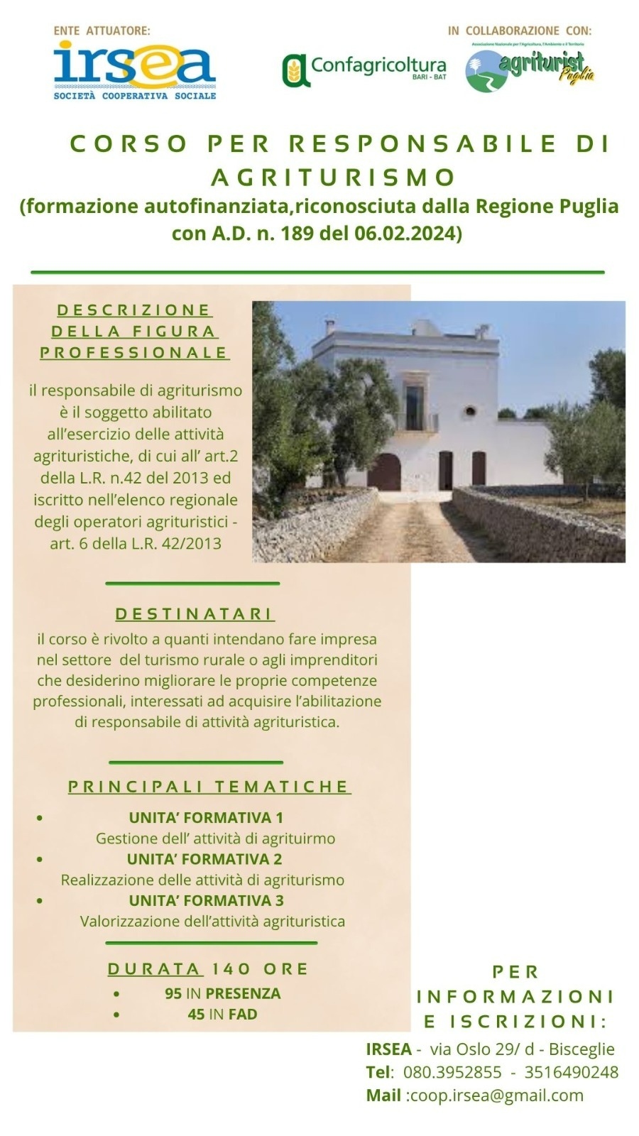 Ultimi posti disponibili per il corso “Responsabile di agriturismo”, attuato da IRSEA in collaborazione con Agriturist Puglia e la nostra Organizzazione.