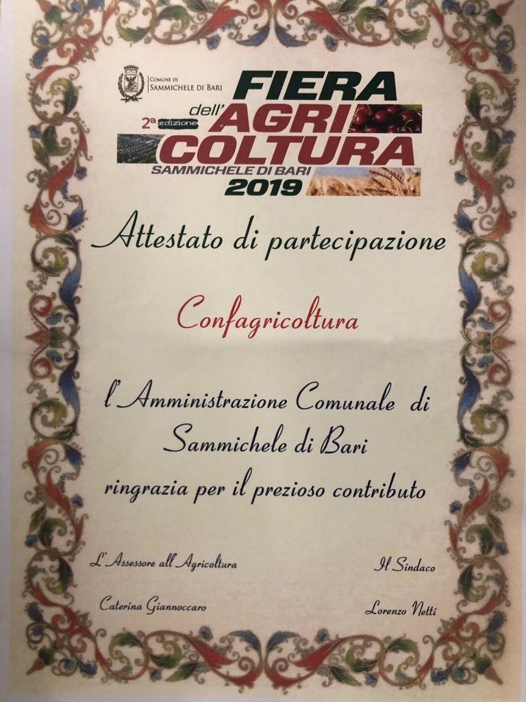 Questa sera, l’Amministrazione comunale di Sammichele di Bari ha consegnato un attestato di partecipazione a Confagricoltura Bari-Bat alla Fiera dell’Agricoltura, ringraziando per il “prezioso contributo”. Lo stand sarà presente anche domani, nell’ultima giornata della Fiera. Vi aspettiamo per altri eventi e degustazioni.
