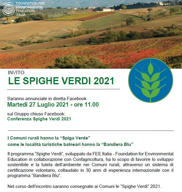 Anche quest’anno la Conferenza di presentazione delle Spighe Verdi 2021 si svolgerà per via telematica. La diretta, gestita da FEE Italia, sarà martedì 27 luglio alle ore 11:00, previa iscrizione al Gruppo chiuso Conferenza Spighe Verdi 2021.