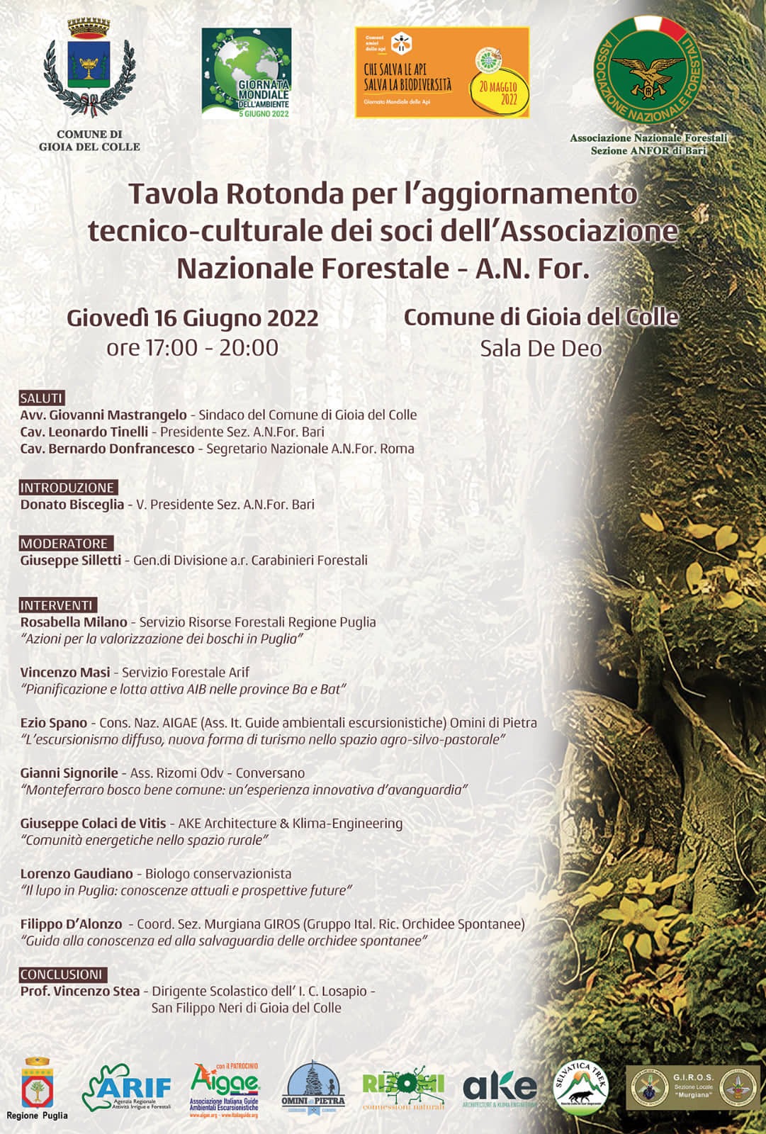 Si svolgerà giovedì 16 giugno a partire dalle ore 17, a Gioia del Colle, nella sala De Deo di Palazzo di città, la Tavola rotonda per l’aggiornamento tecnico-culturale dei soci dell’Associazione nazionale forestale A.N. For. L’incontro sarà aperto dai saluti del sindaco Giovanni Mastrangelo, del cavaliere Leonardo Tinelli, presidente sezione A. N. For. Bari e del cavaliere Bernardo Donfrancesco, segretario nazionale A. N. For. Roma. Introdurrà i lavori Donato Bisceglia, vicepresidente sezione A. N. For. Bari, modera Giuseppe Silletti.