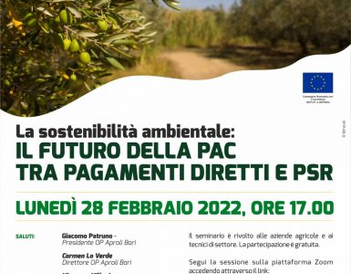 Aproli Bari, in collaborazione con Confagricoltura Bari-Bat, Enapra e Netafim, organizza un workshop dal titolo “Valorizzazione della risorsa idrica in olivicoltura”. L’incontro si svolgerà il prossimo 7 ottobre, alle 16, a Bisceglie, in via Lamaveta 5. I relatori che parteciperanno sono il Prof. Salvatore Camposeo dell’Università di Bari, Guillermo Pellegrino, Martino Dinoia e Alberto Puggioni della Netafim.