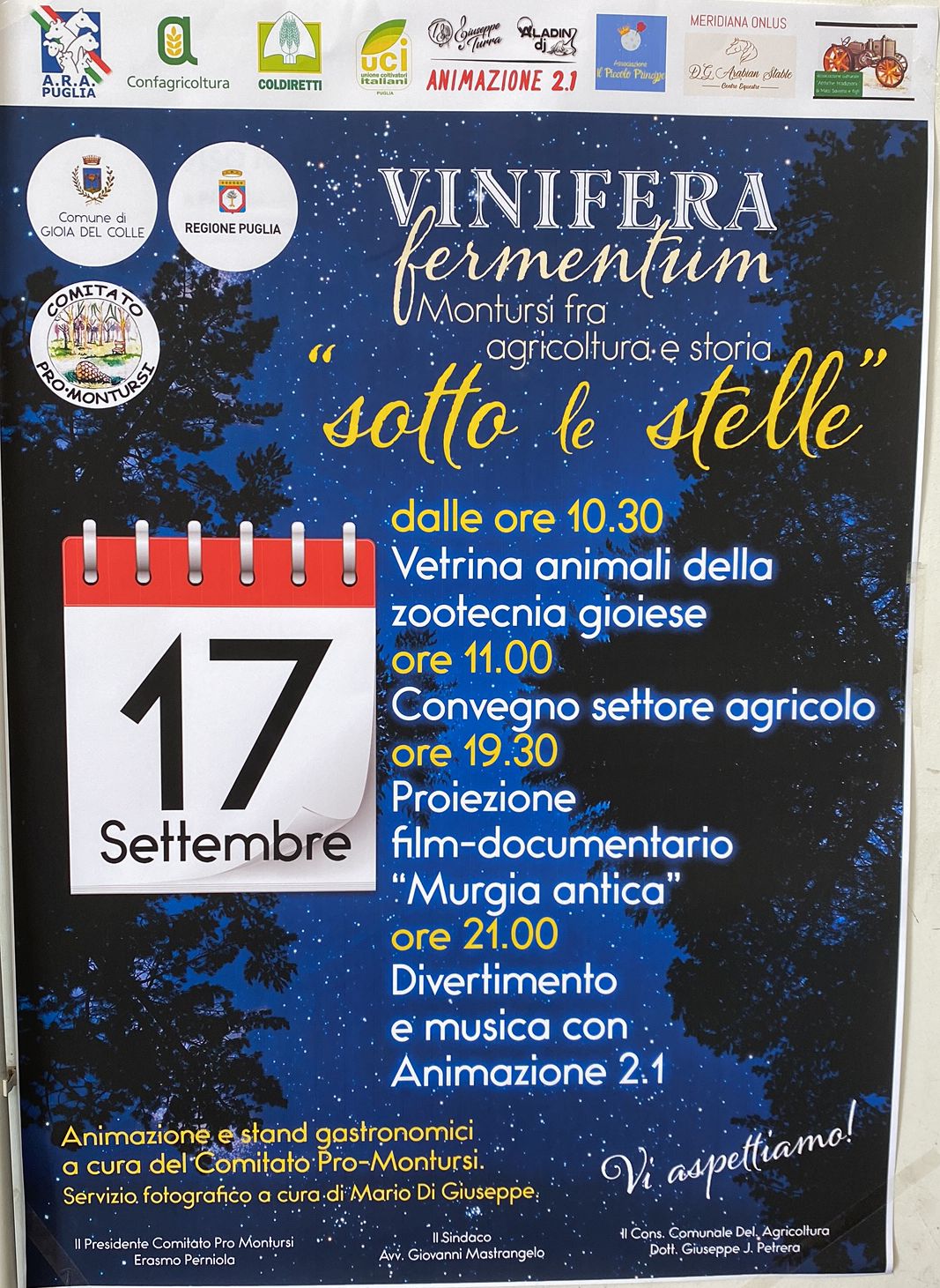 Si terrà il prossimo 17 settembre, a Gioia del Colle, “Vinifera fermentum sotto le stelle” organizzato dal comitato Pro-Montursi. Ricca di appuntamenti la giornata, si inizia alle 103.0 con la vetrina animali della zootecnia gioiese; alle 11 ci sarà un convegno sul settore agricolo; alle 19.30 la proiezione di un film documentario “Murgia antica” e dalle 21 divertimento e musica.