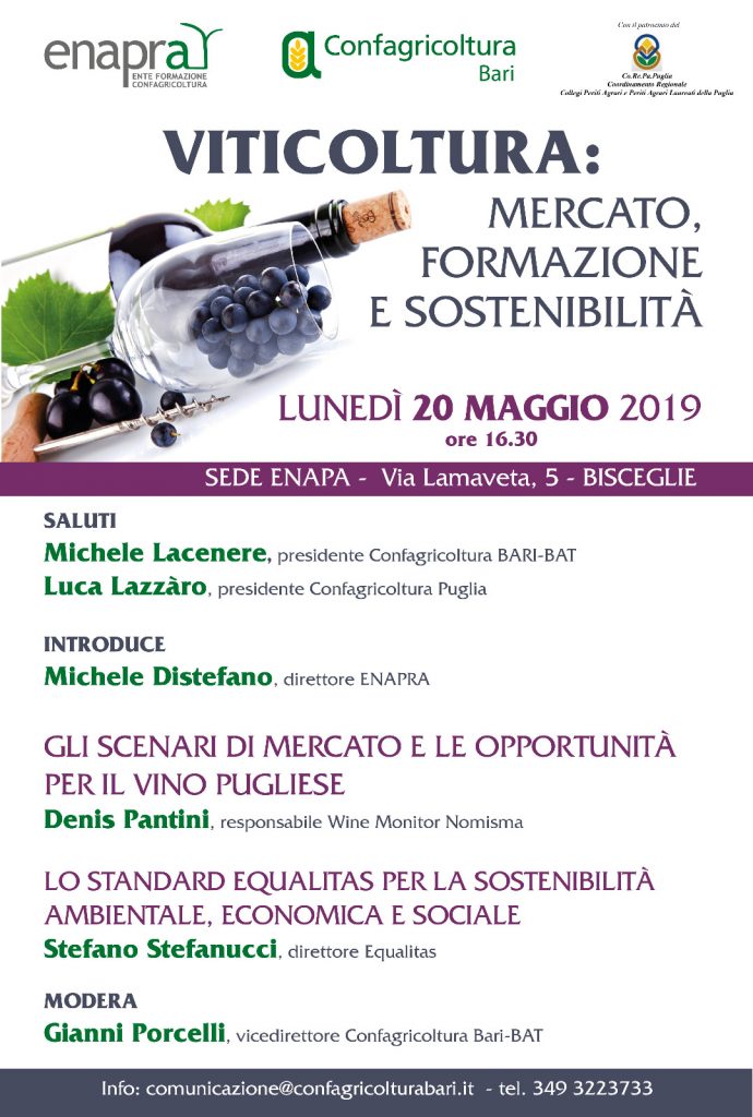 Confagricoltura Bari-Bat ed Enapra, con il patrocinio del Coordinamento regionale Collegi periti agrari e periti agrari laureati della Puglia, hanno organizzato un importante incontro formativo dal titolo “Viticoltura: mercato, formazione e sostenibilità” che si svolgerà lunedì 20 maggio, alle 16 e 30, nella sede Enapa in via Lamaveta, 5, a Bisceglie.