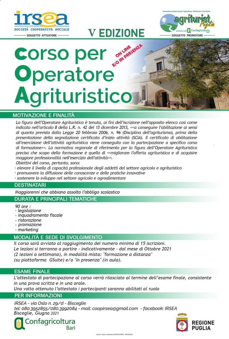 E’ IRSEA, soggetto attuatorie, con Agriturist Puglia, soggetto promotore, e Confagricoltura Bari, a organizzare questa quinta edizione: il certificato di abilitazione all’esercizio dell’attività agrituristica verrà conseguito con la partecipazione alle lezioni. La durata del corso, a pagamento, è di 90 ore, mentre i principali temi oggetto delle lezioni sono: legislazione, inquadramento fiscale, ristorazione, promozione, marketing.