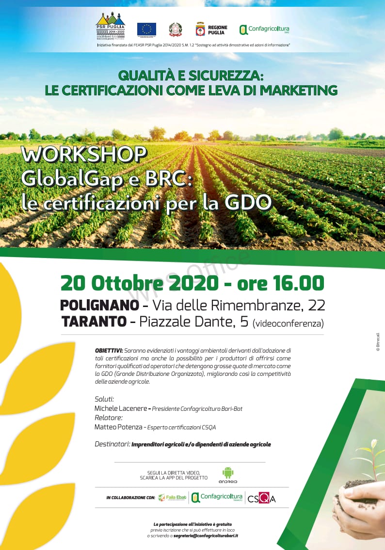 Il secondo appuntamento con i workshop di Confagricoltura Bari-Bat sul tema “Qualità e sicurezza, le certificazioni come leva di marketing”, organizzati attraverso i finanziamenti della misura 1.2 del Psr Puglia 2014/2020, si svolgerà oggi pomeriggio alle 16 solo in modalità da remoto in ottemperanza all’ultimo DPCM per l’emergenza coronavirus.