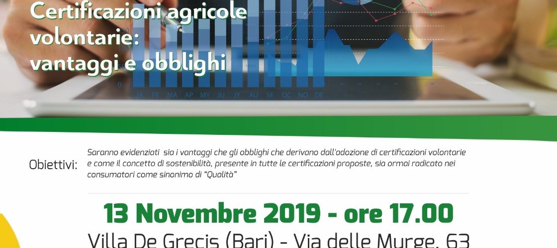 L’evento, che si terrà mercoledì 13 novembre alle ore 17.00 a Bari a Villa De Grecis, in via delle Murge 63, illustrerà le principali certificazioni, evidenziando sia i vantaggi che gli obblighi che derivano dall’adozione di certificazioni.