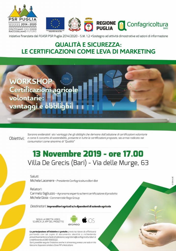 Confagricoltura Bari organizza il primo workshop su “Certificazioni agricole volontarie: vantaggi e obblighi” che rientra in un progetto, attivato con la SM 1.2 del PSR Puglia 2014-2020, intitolato “Qualità e sicurezza: le certificazioni come leva di marketing”.